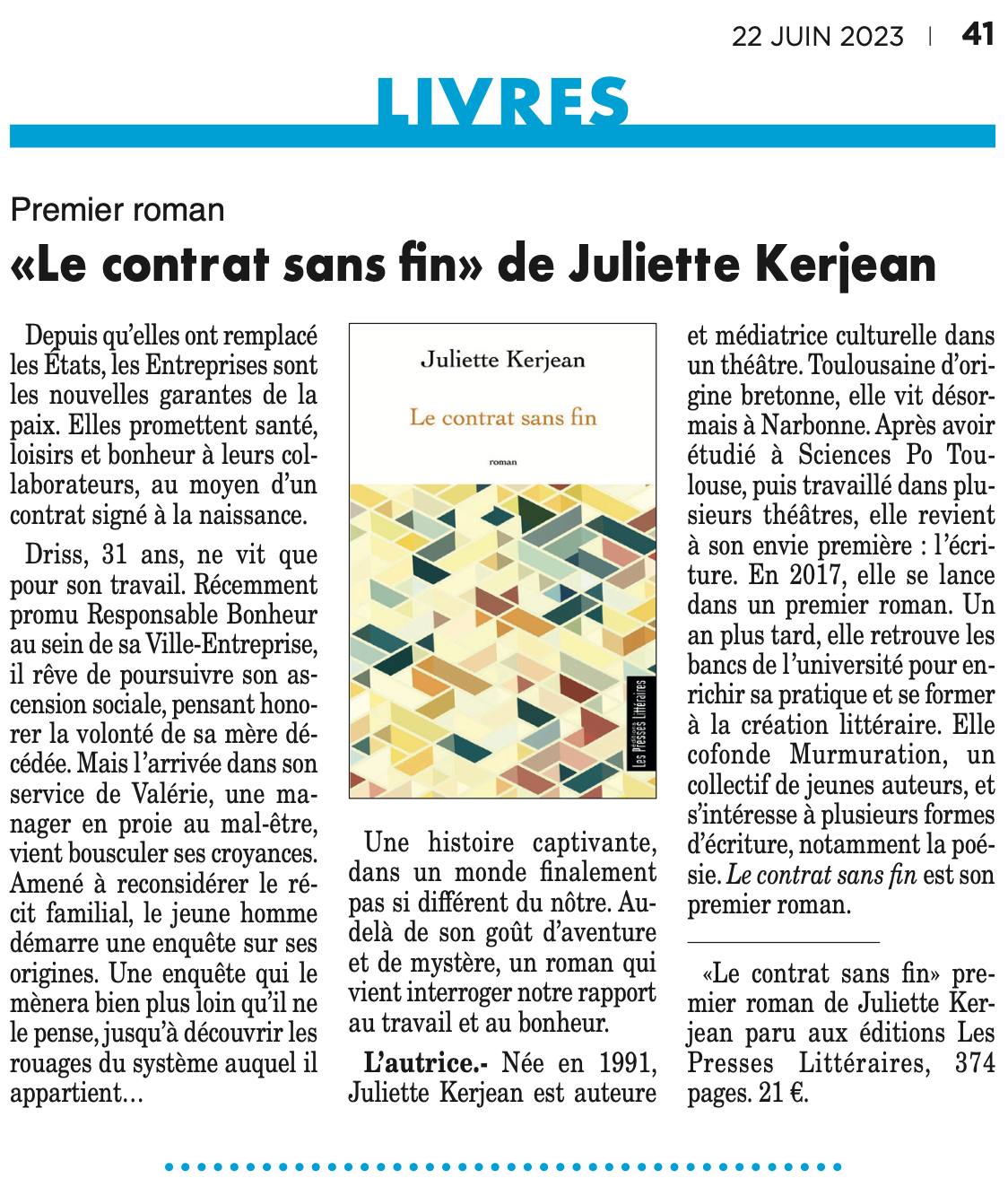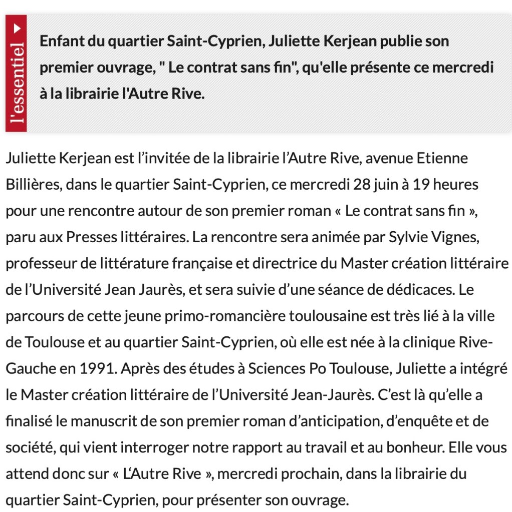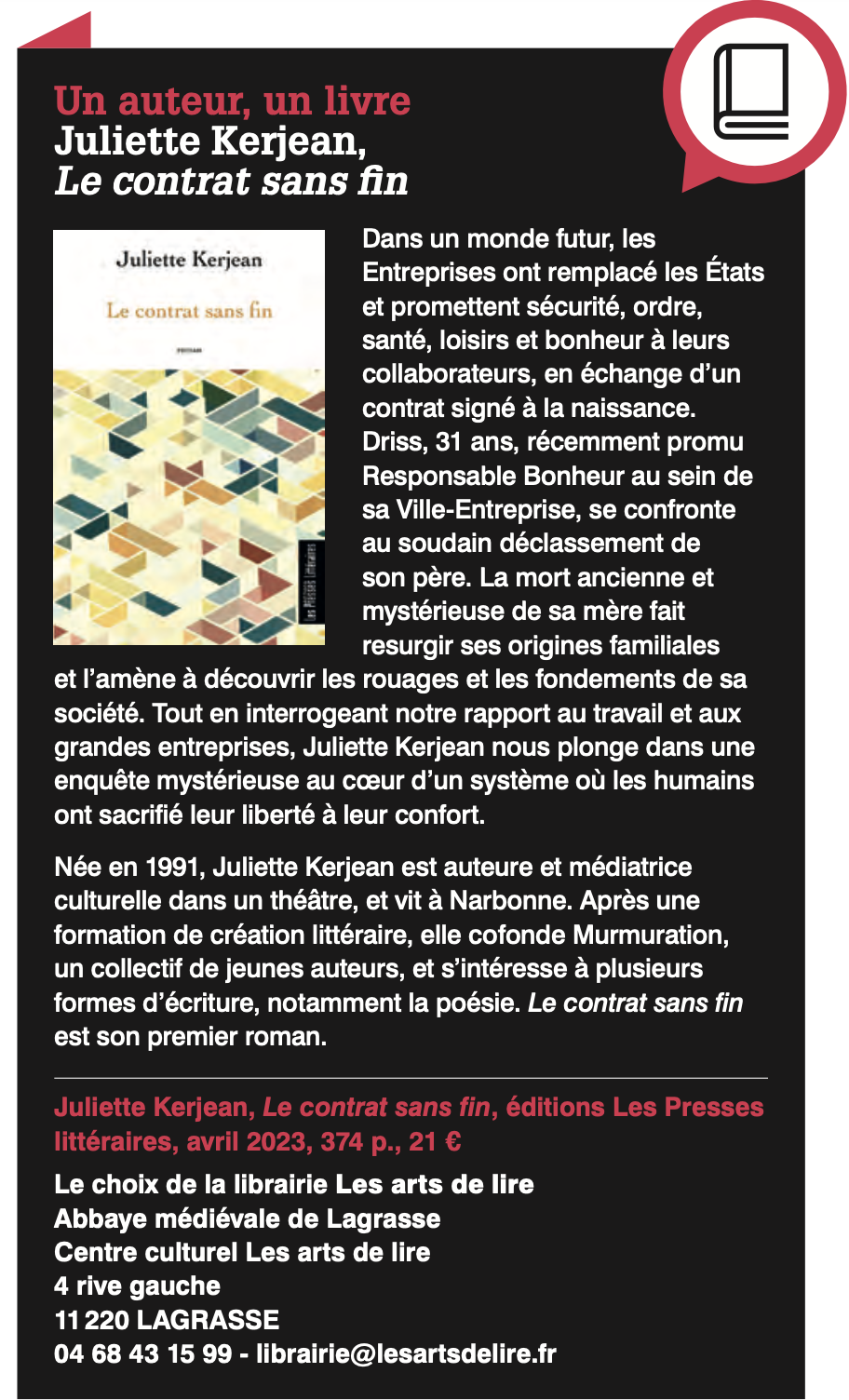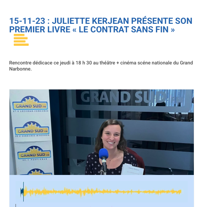 18h : Lecture musicale et rencontre avec Juliette Kerjean, auteure du roman Le contrat sans fin (Les Presses Littéraires)