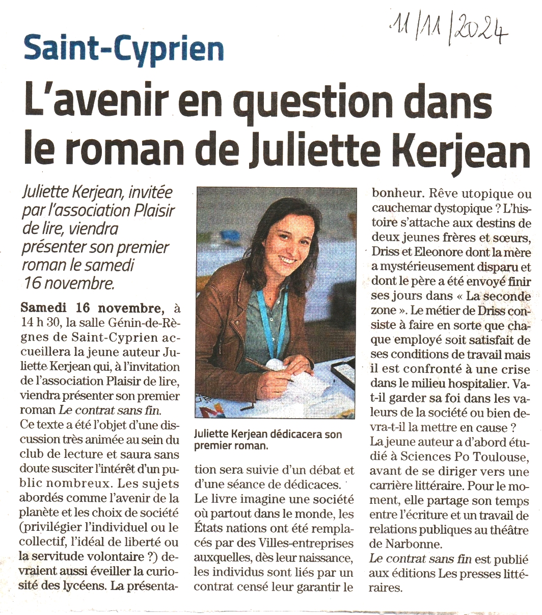 - Samedi 16 novembre 2024 — Saint-Cyprien (66) — Rencontre littéraire organisée par l’association Plaisir de Lire