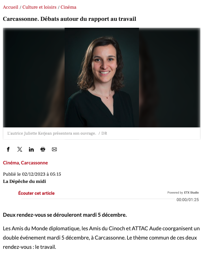 - Mardi 5 décembre 2023 — Carcassonne (11) — L’Odeum — Rencontre littéraire organisée par les Amis Du Cinoch’ avec le soutien des Amis du Monde Diplomatique Aude